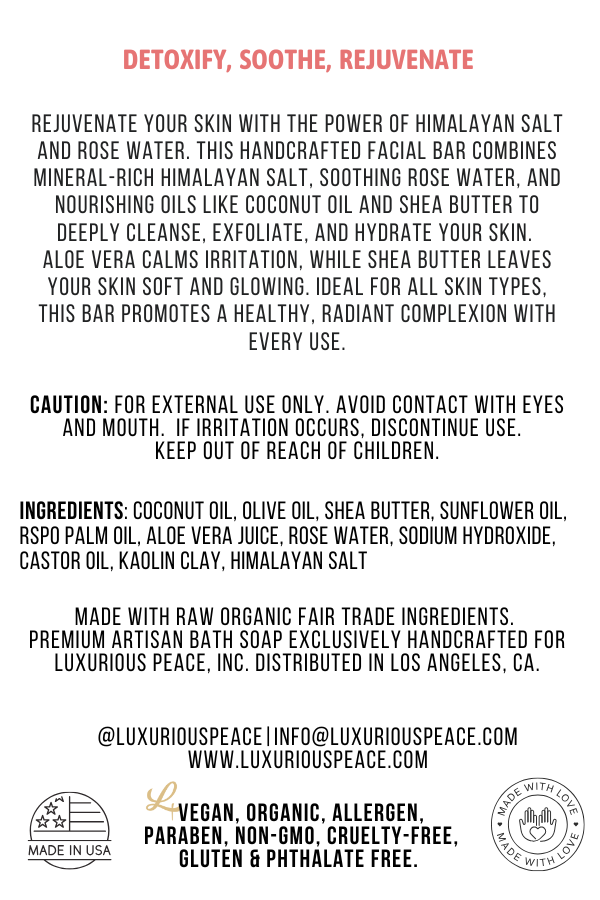 Himalayan Salt naturally draws out toxins and impurities, helping to cleanse your pores while nourishing your skin with essential minerals. The calming properties of Rose Water work to soothe your skin while promoting hydration, making this bar perfect for those looking for a detox that leaves skin soft, smooth, and balanced.