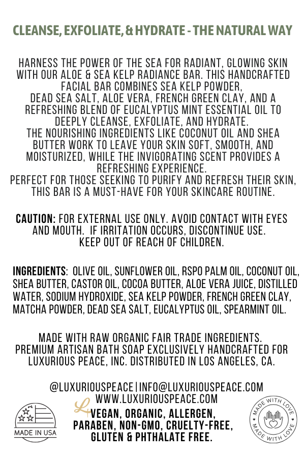 The Sea Kelp Powder and Dead Sea Salt work together to draw out impurities and excess oil from deep within your pores, helping to purify and detoxify your skin. French Green Clay adds an extra layer of deep cleansing, while Aloe Vera soothes any irritation promoting a healthy, radiant complexion.